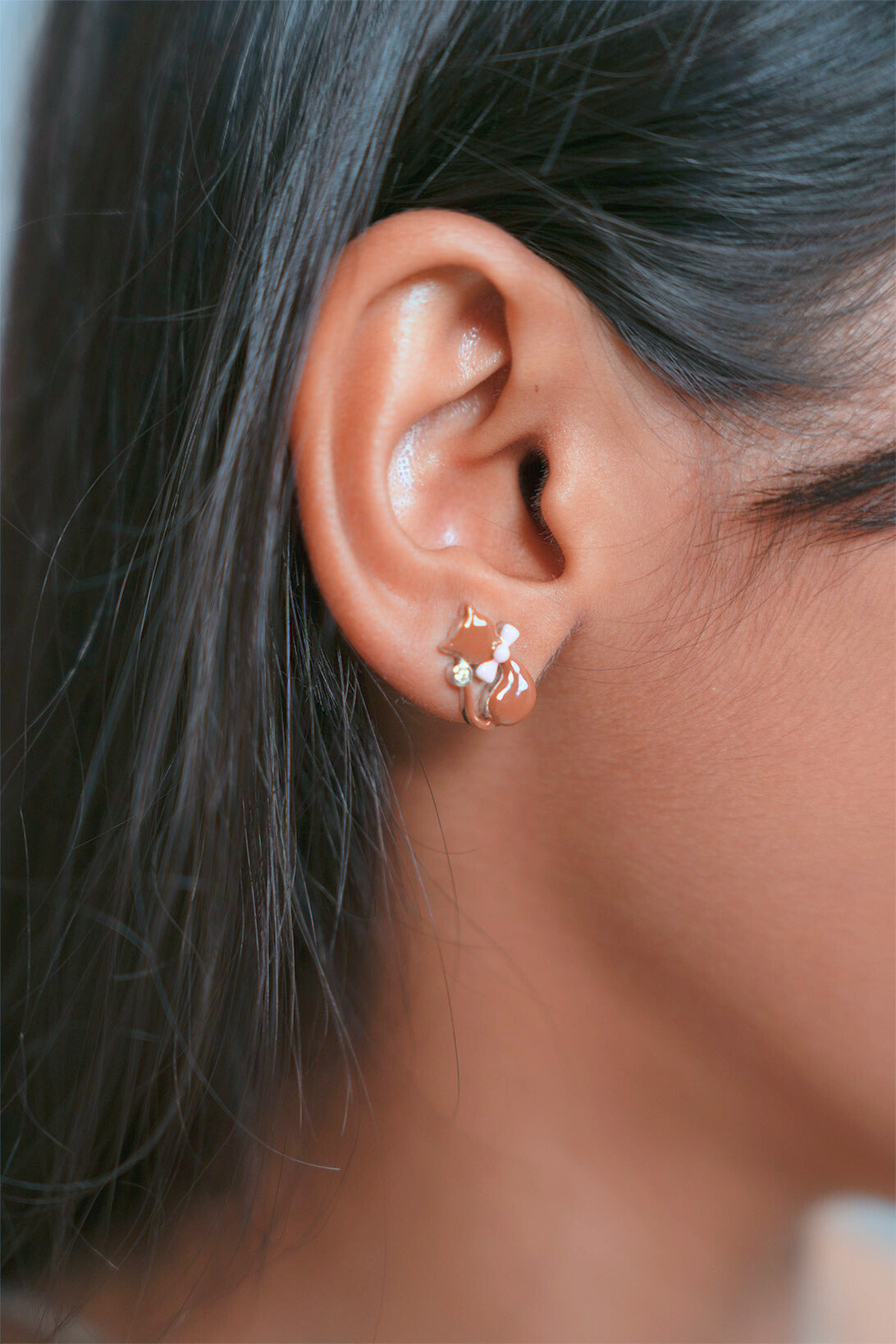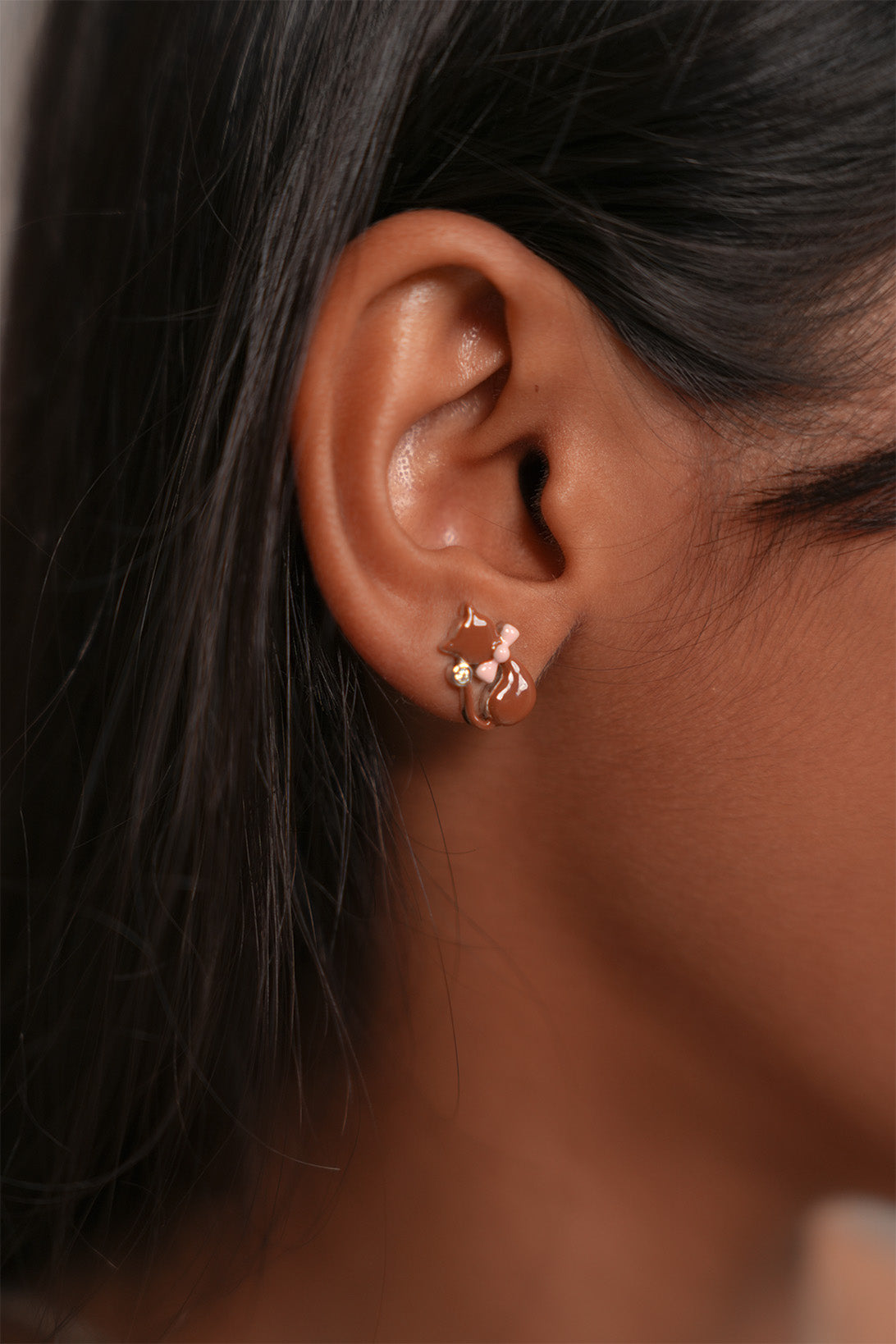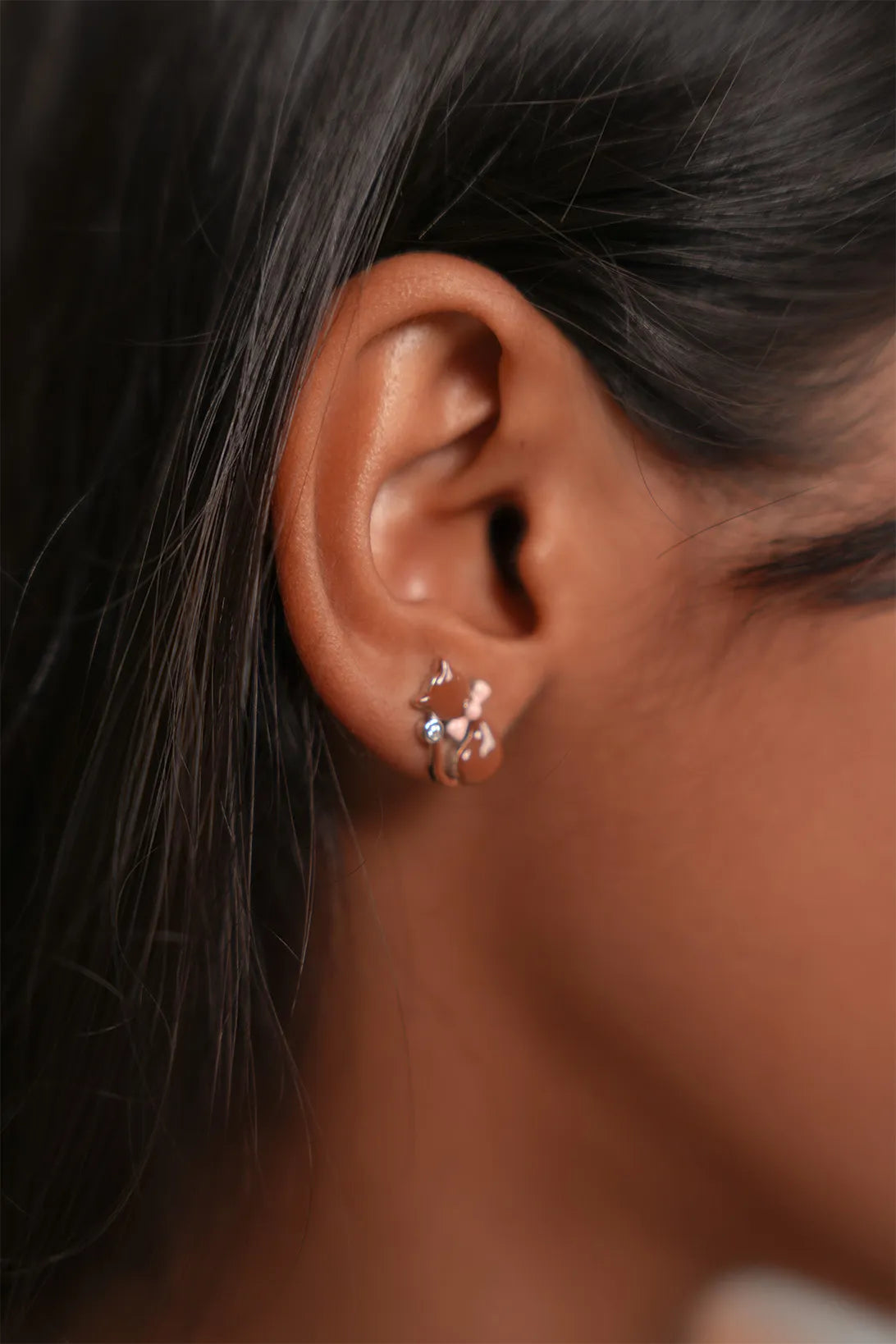 Earrings: The set includes a pair of perfectly matching cat stud earrings. These are miniature versions of the pendant, featuring the same brown enamel cat, pink bow, and a tiny clear crystal accent, creating a beautifully coordinated look.