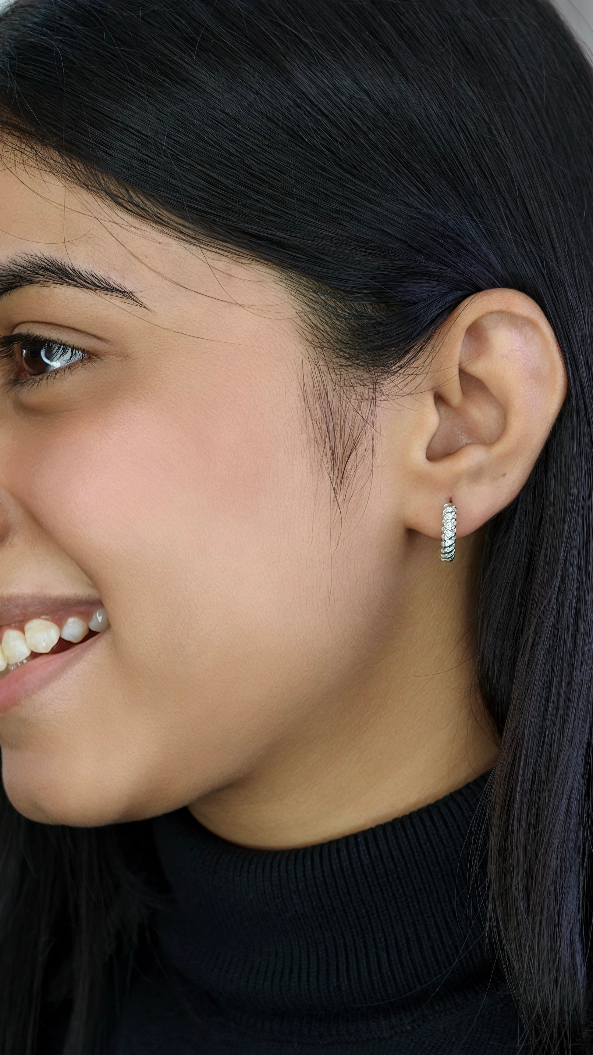 Add a touch of organic texture to your jewelry rotation with our Scalloped Infinity Huggies. These sophisticated mini-hoops feature a unique, undulating scalloped edge that creates a wave-like silhouette around the ear. Each curve is meticulously channel-set with round brilliant-cut stones, ensuring a continuous line of shimmer that catches the light from every angle.